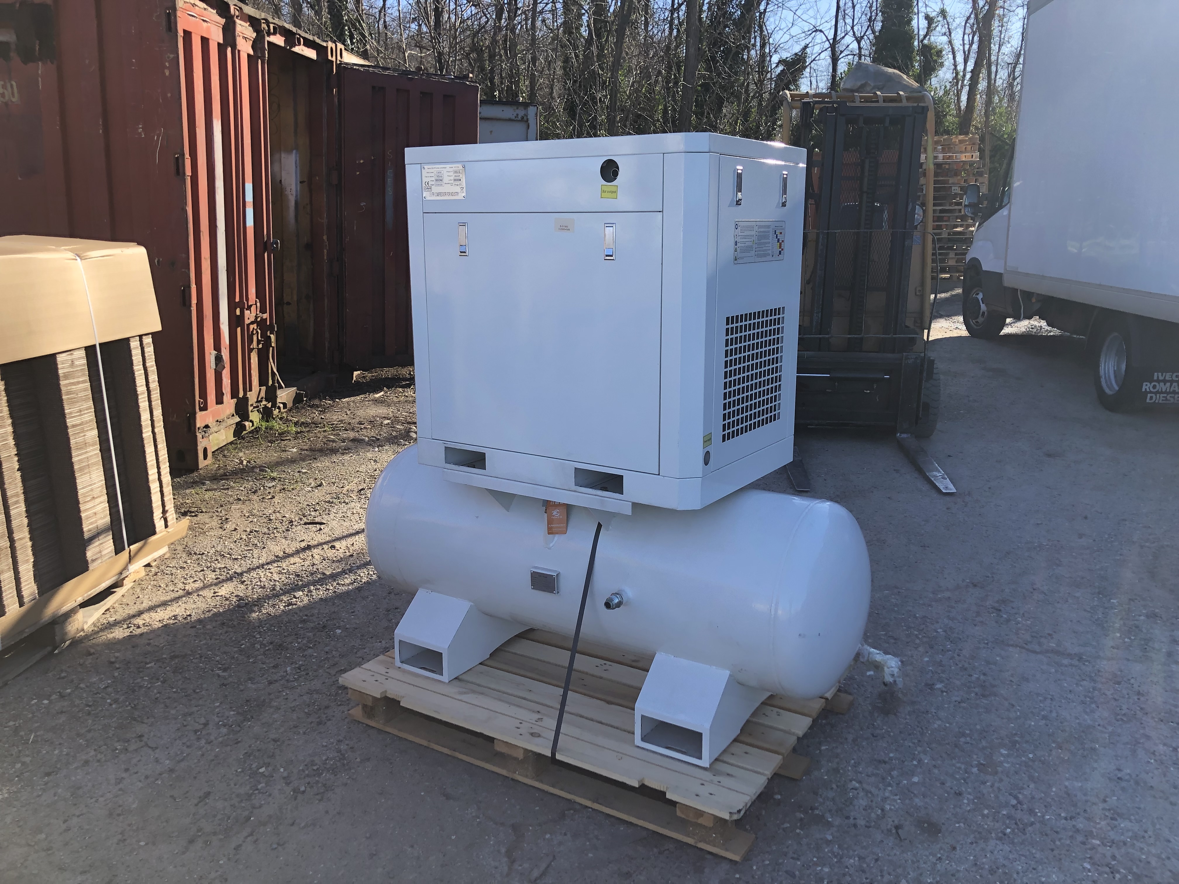 Descrizione Compressore a vite super silenziato‚ modello HV-7.5 Alimentazione 380volt 7‚5 kW 10 hp con serbatoio 330 litri‚ pannello digitale per comandi‚ inverter per gestione motore‚ pressione regolabile fino a 10 bar. Mai usato 0 ore Dimensioni (cm): 140 x 80 x 150
